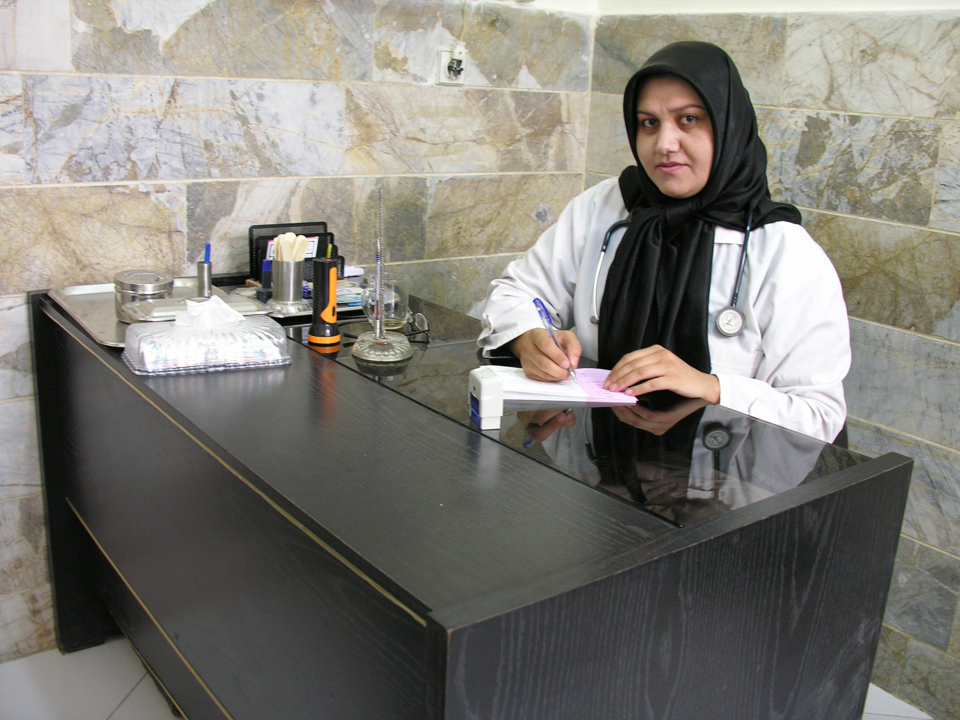 Afghan refugee Nasibah Heydari sits in her office. With hard work and determination, she has achieved a dream by qualifying to become an obstetrics surgeon in Iran.