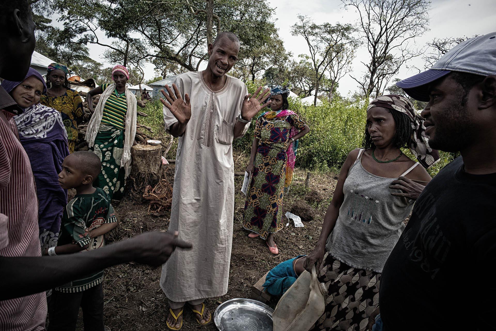 The chosen shelter is the one closest to the shelter where Idris and Adjara have been living. But there is an issue. Another woman has been living there for several days, building a cosy home for her children, and she squarely refuses to leave. As the negotiations grow tense, a curious crowd gathers around. The woman, tired of arguing, declares the discussion over by walking away. She sits down to crush the manioc leaves in her mortar, pounding and sighing loudly with each blow.