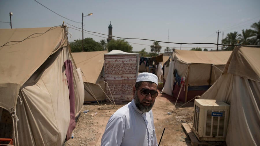 BAGHDAD, Iraq, Aug 03 (UNHCR) - Rows of tents at Hayya alJami'a camp reflect in Sheikh Ramzy Abu Seif's oversized sunglasses. A fast-talker dressed in a long white disdasha, clutching a rugged two-way radio, Abu Seif juggled a crowd of local officials, minions and camp residents looking to lodge complaints, request a favour or just stopping by for tea and a smoke.