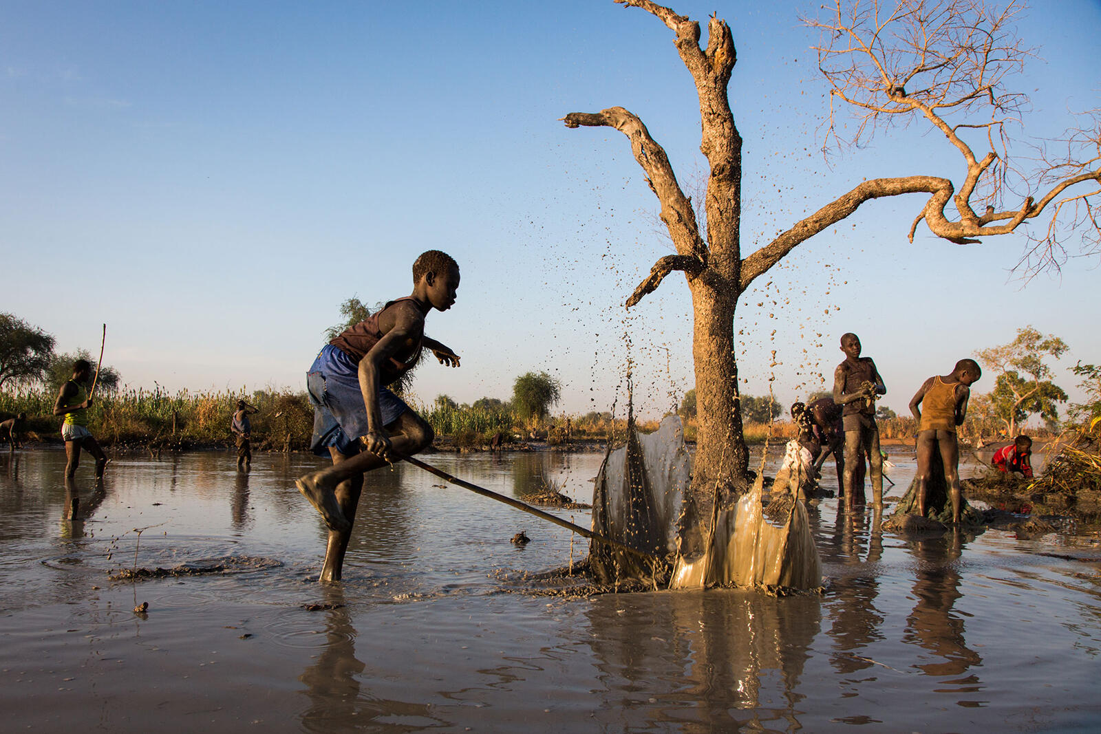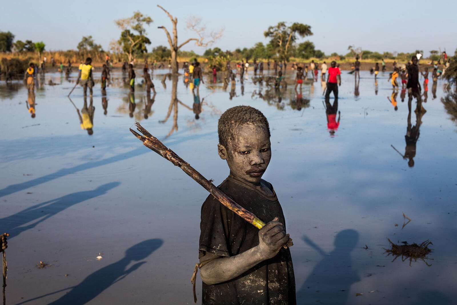 Yacob, a 10-year-old refugee, uses a stick to catch fish near Yida, South Sudan.