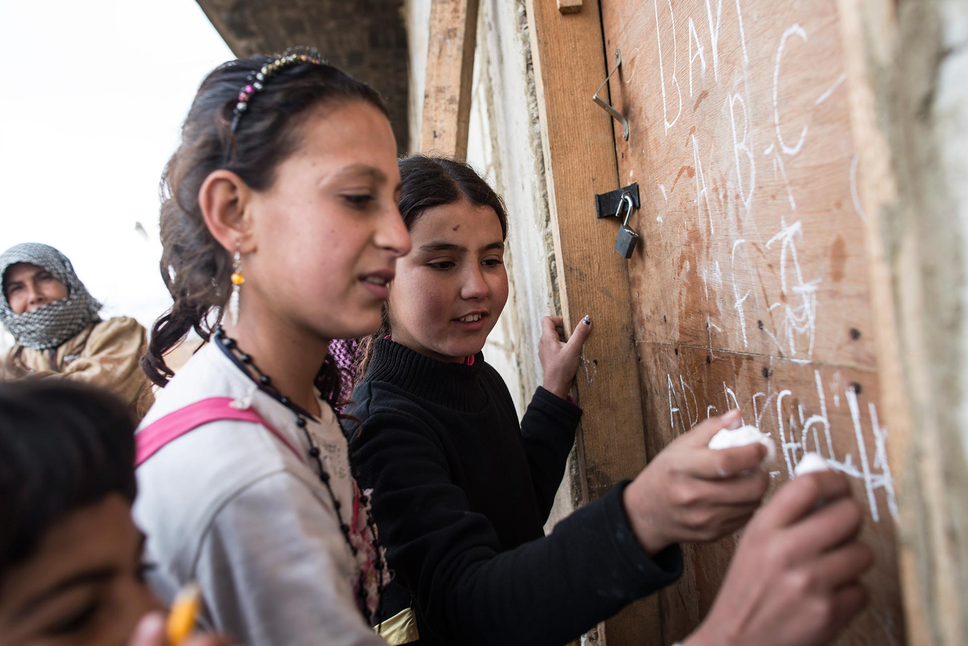 Eleven-year-old Hanan (right) teaches other young refugees to write in Lebanon's Bekaa Valley. She's the closest thing they have to a teacher, so they call her ‘Miss Hanan’.