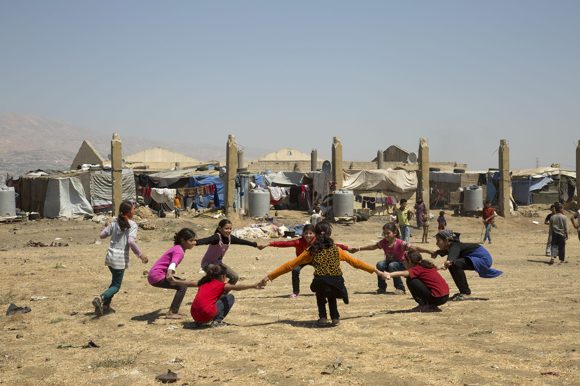 Syrian girls play near an abandoned factory in Lebanon's Bekaa Valley. Access to education is limited, so many refugee children here work, peeling garlic, to help support their families.