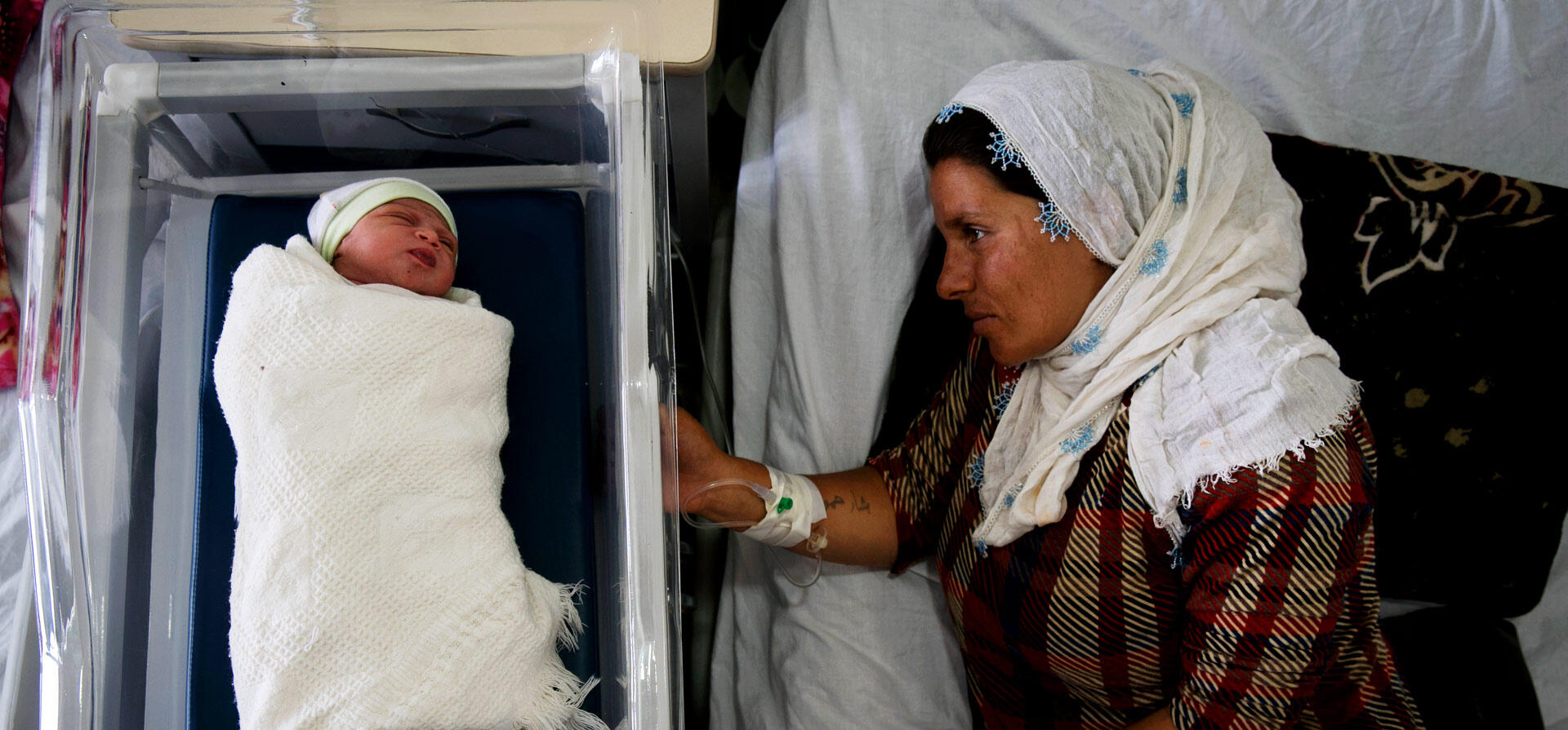 Dalia looks at her newborn daughter Joza at a clinic in the Domiz refugee camp.