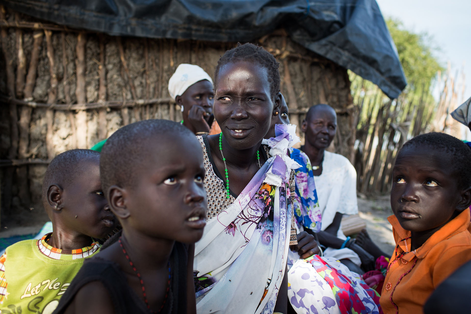 Nyathay (left) and Nyaruach hold two of their young children outside the home of a stranger who invited them to stay for the night in Leer, Unity State, South Sudan.