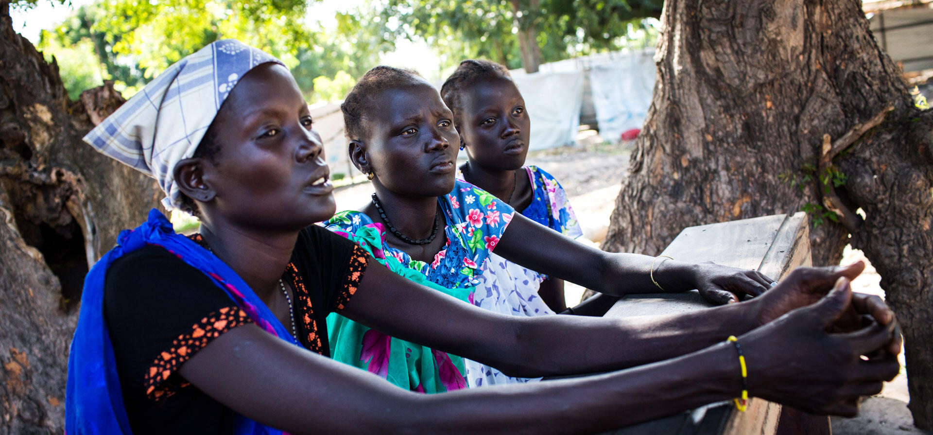 Nearly a year after they fled, Nyathay Duop, 22, Nyaruach Malol, 30, and Nyuot Duop, 24, return home to Leer, in Unity State, South Sudan.