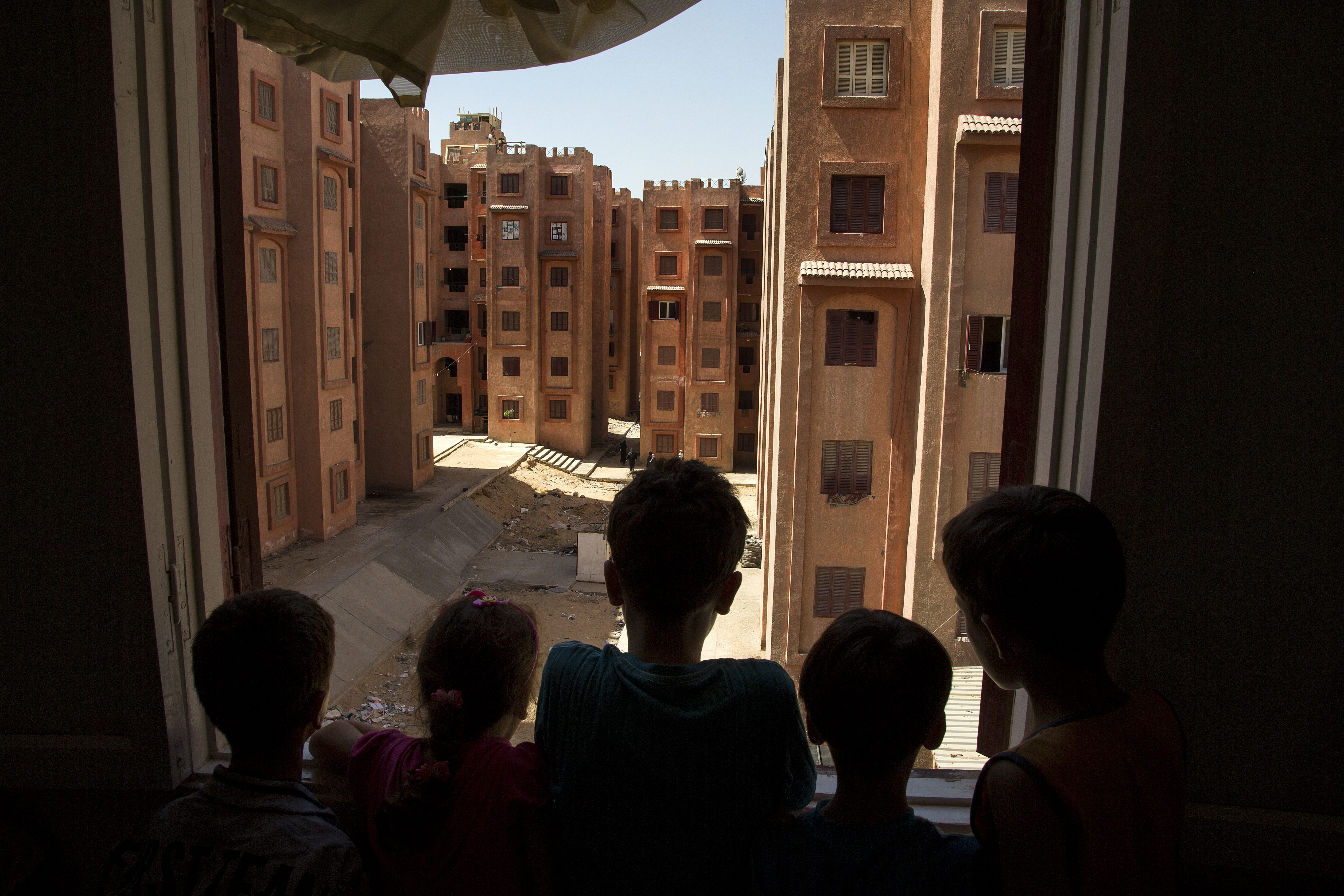 Syrian refugee children look out on a trash strewn common area from their family's apartment window in the lower income Masaken Osman neighborhood on the outskirts of Cairo, Egypt. There are no schools there and no playgrounds.