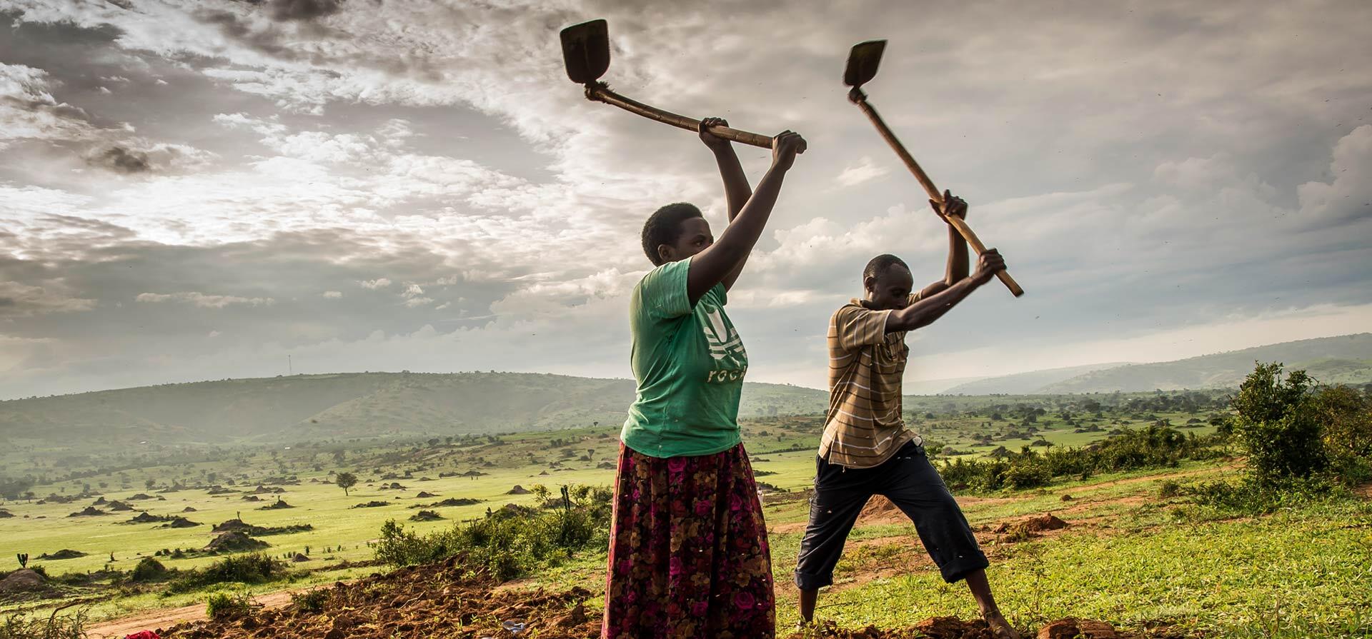 Refugees Amina and Syriak till the soil in Uganda.