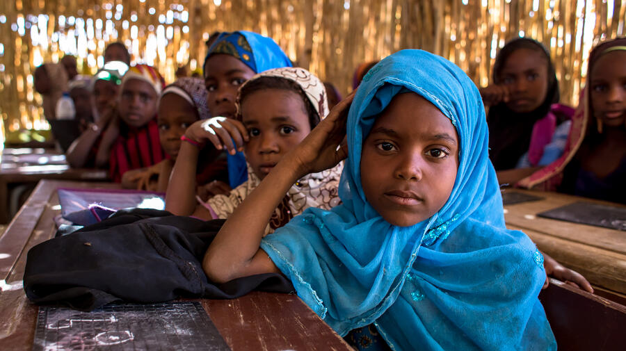 Young girls attend a maths class at a school in Niger's Diffa region, where more than half of the students are Nigerians who have been displaced by fighting.