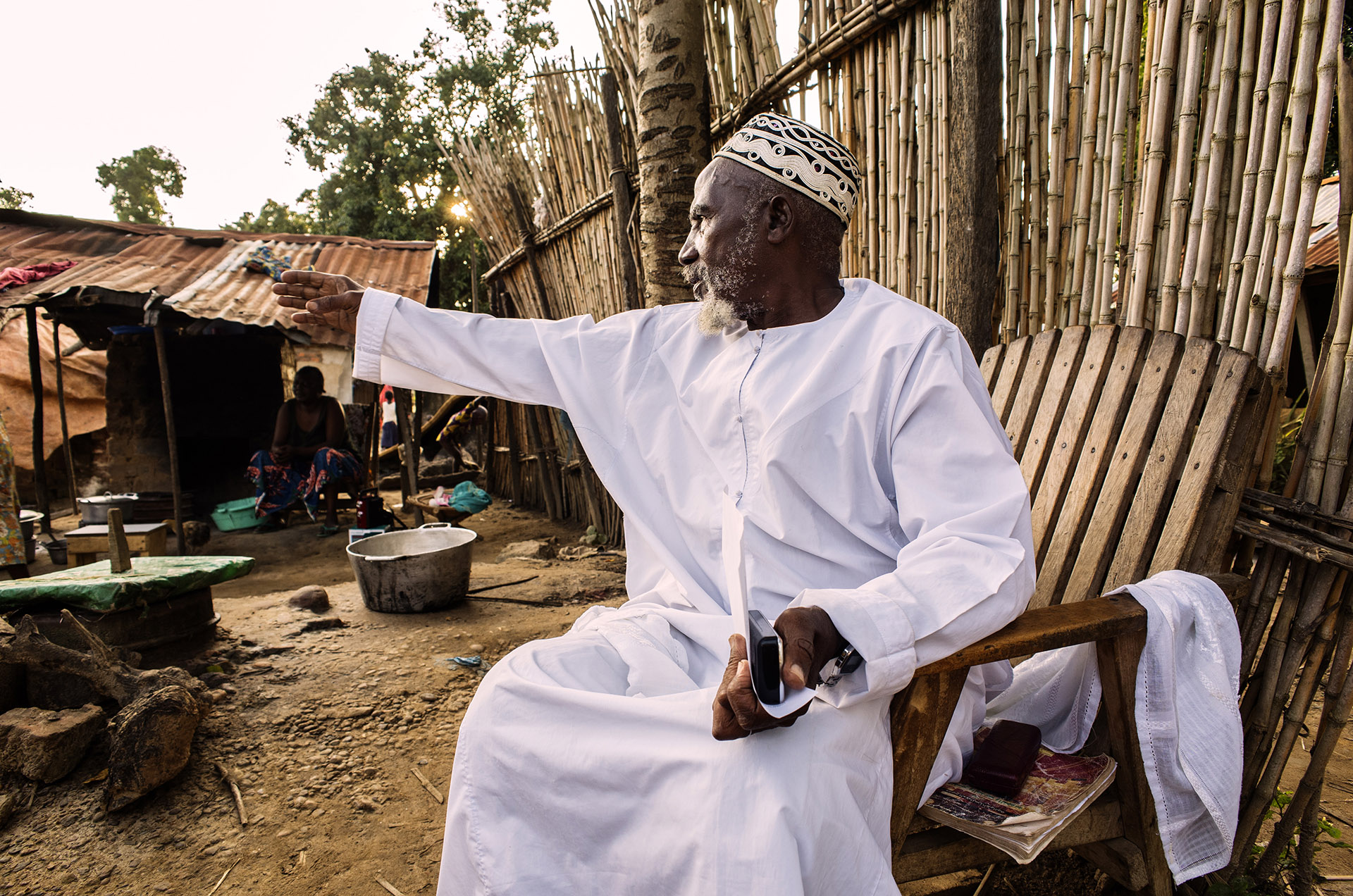 Like Sister Maria, Moussa Bawa, the 72-year-old Imam of Zongo, also helps refugees who arrive from CAR. He was born in Libenge in DRC's Equateur Province and has lived in Zongo for 34 years. I meet him in his house where he is assembling CAR refugees to discuss reconciliation.