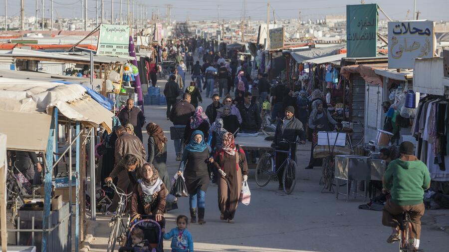 Shoppers throng the commercial hub of Za'atari refugee camp in Jordan. Here people can buy mobile phones, groceries, even wedding dresses.