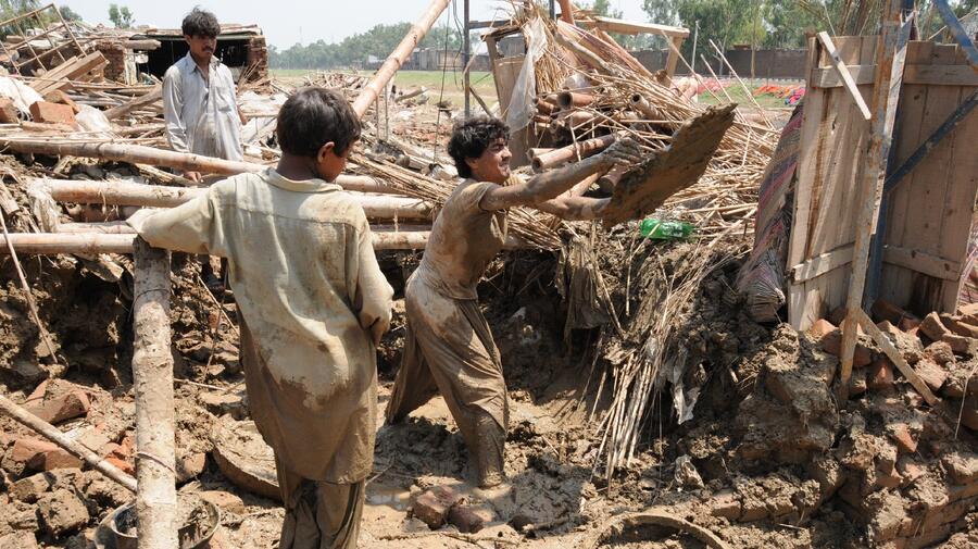 Then came the worst floods in Pakistani history. The camp was flattened. The only building left standing is the community mosque. Everything is covered in a meter of thick, sticky, dark brown mud. Piles of wooden beams and other debris litter the jagged landscape. Naizbibi's family lost their home, their belongings and their livestock, including two cows, a calf and five goats. "We have only now the clothes on our backs," she told me, cradling a crying infant in her arms.