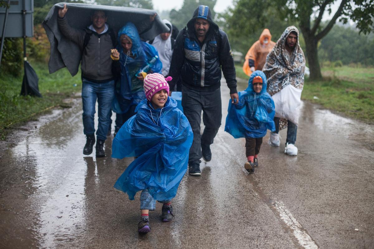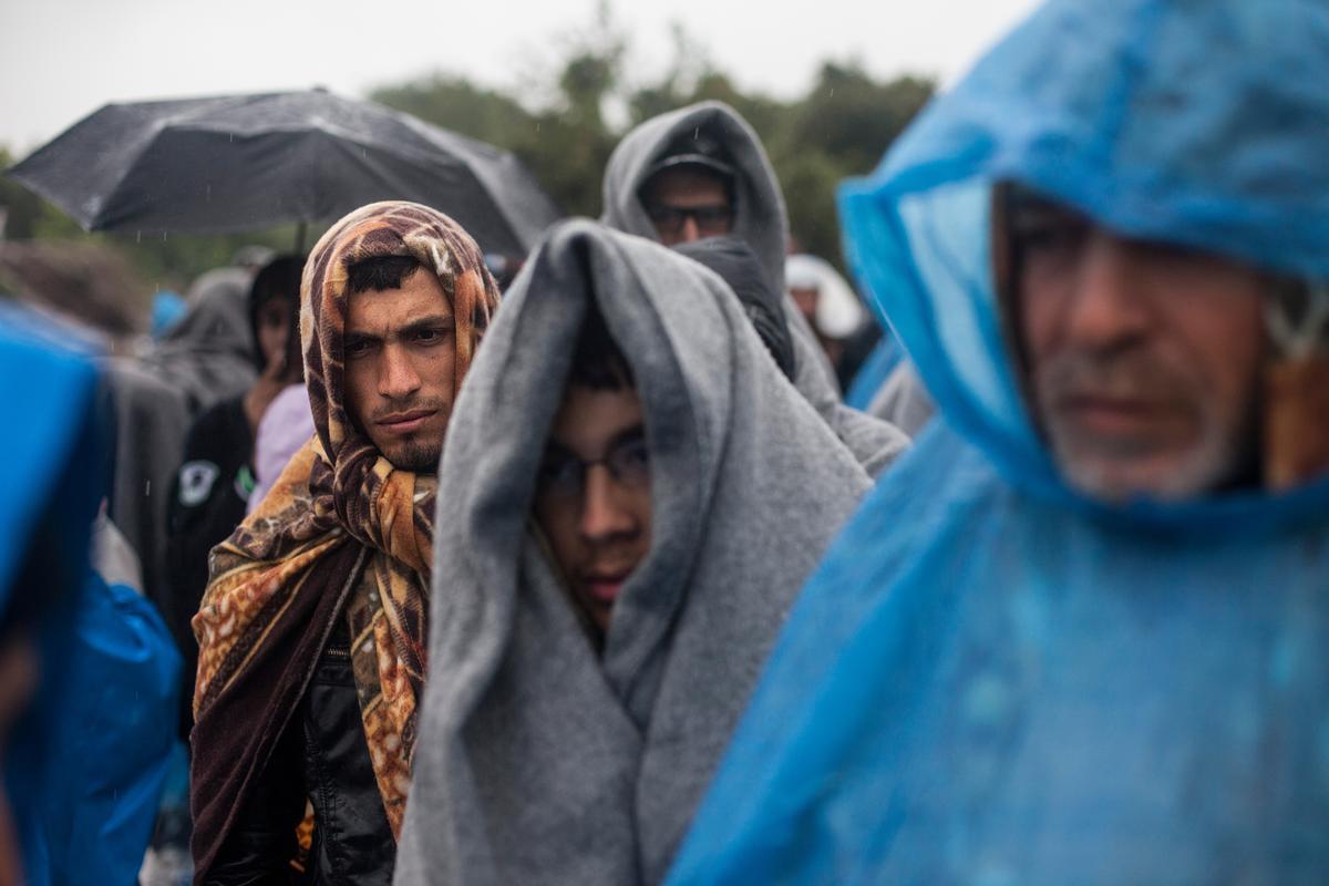 Refugees use a UNHCR tent to protect themselves from the rain as they arrive in Bapska, Croatia.