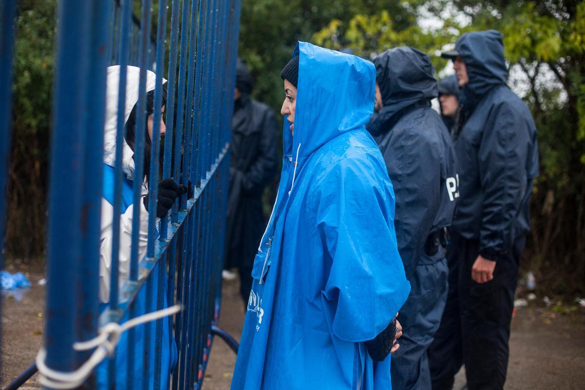 The gates open, and a new line of refugees squelches past, their shoes wrapped in UNHCR plastic bags, grabbing cups of tea from a contingent of Swiss by the roadside.