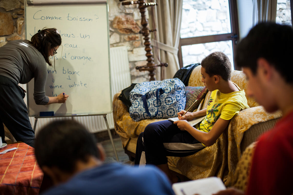"When they first arrive at the hotel, many of the kids are lost and can't behave after everything they've been through," says Manar, whose family endured a traumatic escape from Syria and arrived on the Greek island of Samos in February. "Class gives them a routine and something to do. They calm down and start learning again."