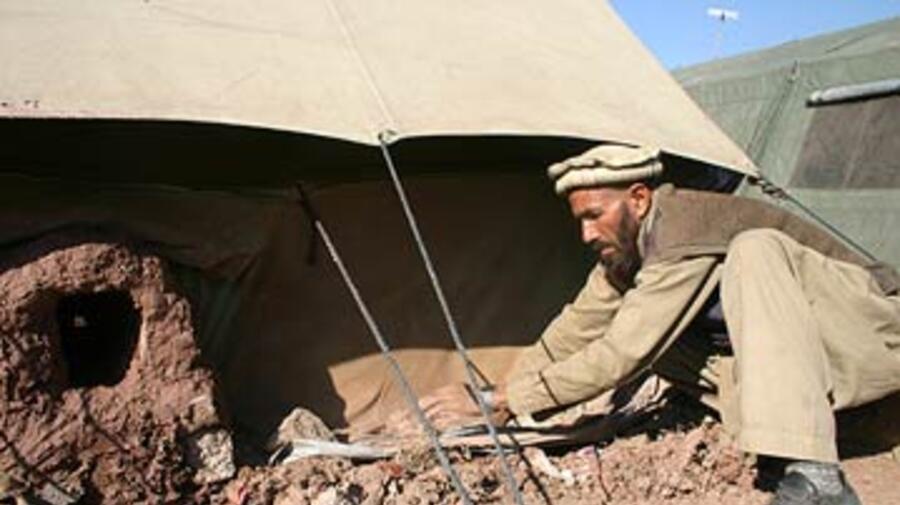 Abdul has so far set up these demonstration tents in six camps in the Mansehra and Balakot areas. Fellow Afghan Dilawar is now in Muzaffarabad, the capital of Pakistan-administered Kashmir, to build several more. Trained as a tailor in Barary camp, the 27-year-old is taking a break from his sewing shop in Mansehra to spread the word on the fireplace.