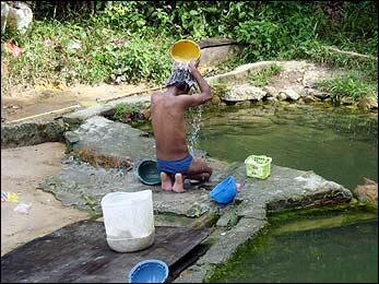 An asylum seeker from Mynamar takes a bath in a pool at a makeshift jungle camp in Malaysia.