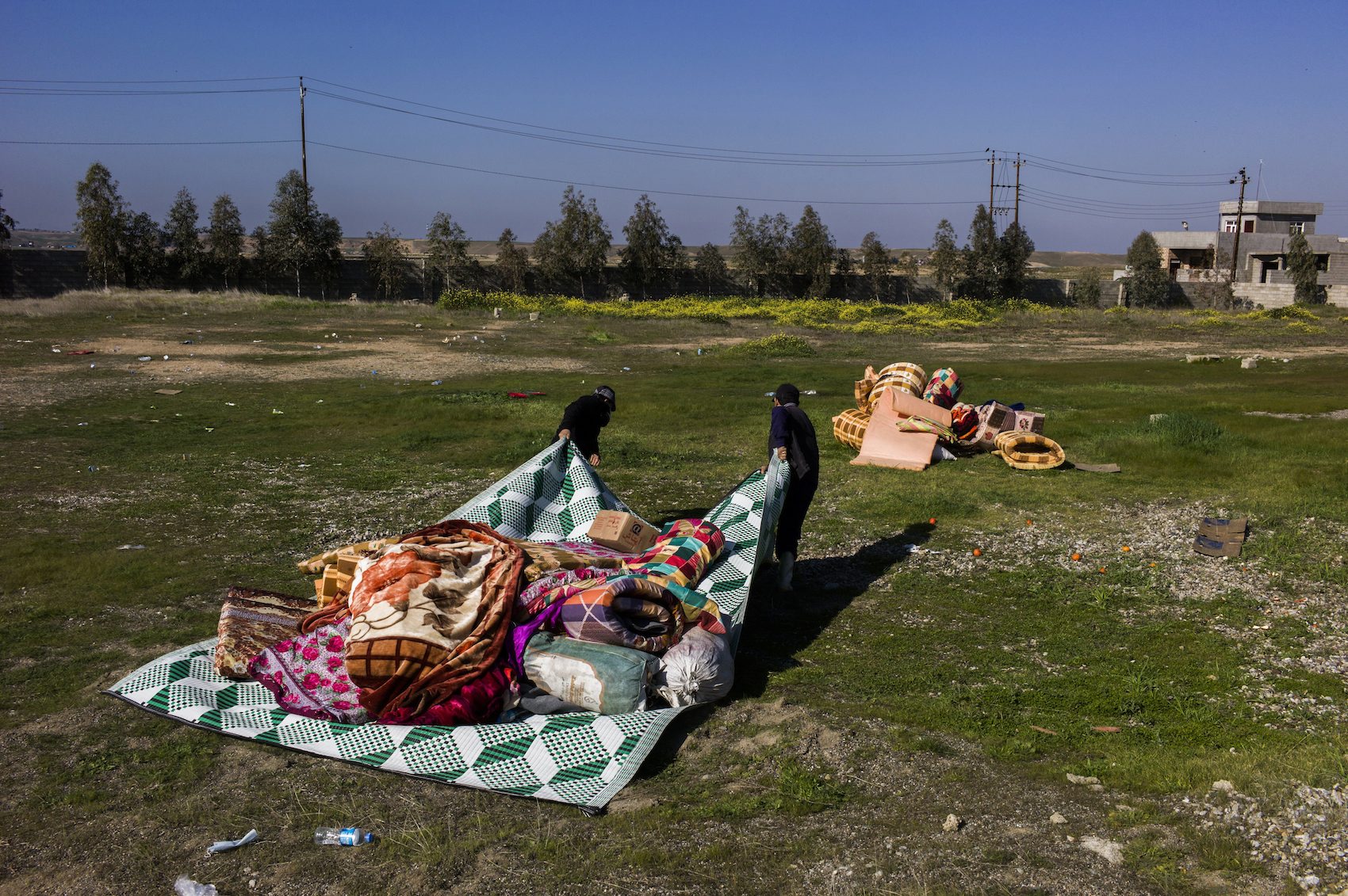 Two men carry the blankets and mattress used by a group of 196 internally displaced people from the Yazidi religious community following their release by militants.