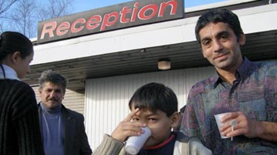 Hungarian Roma asylum seekers in front of a refugee reception centre in Malmö, Sweden.
