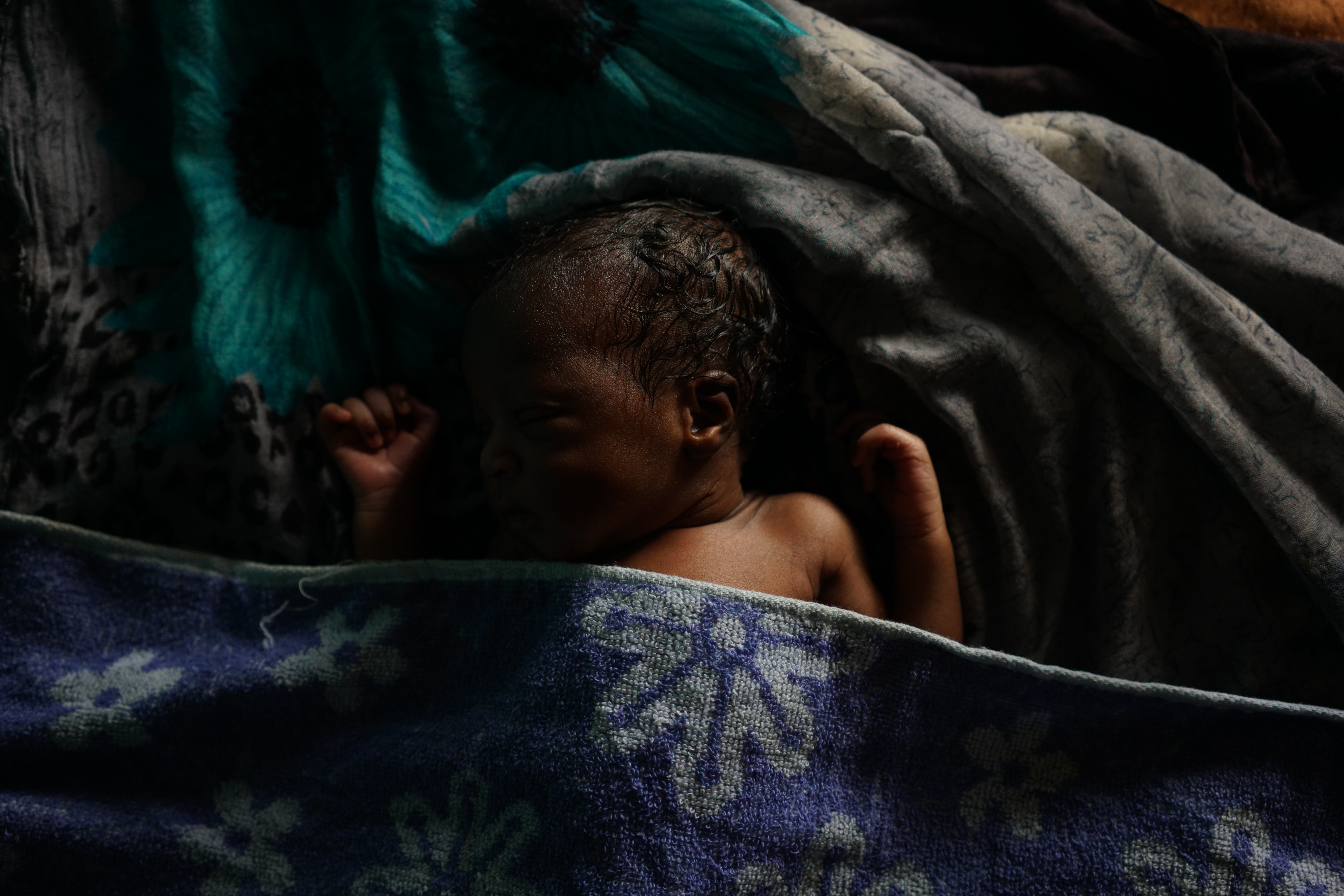 A two-day-old Sudanese baby sleeps at a reception centre in Agadez which provides shelter and medical services to refugees and other people who have been forced to flee home.
