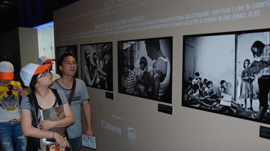 Chinese visitors to Expo 2010 study some of the photos of displaced people in three cities taken by award-winning photographer Zalmaï, himself a former refugee.