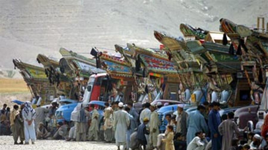 Dozens of trucks laden with refugees from Pakistan stop at a refugee centre near Kabul. Seventy families returned home on Tuesday, bringing the UNHCR-assisted voluntary repatriation of Afghans from Pakistan past the 100,000 mark for this year.