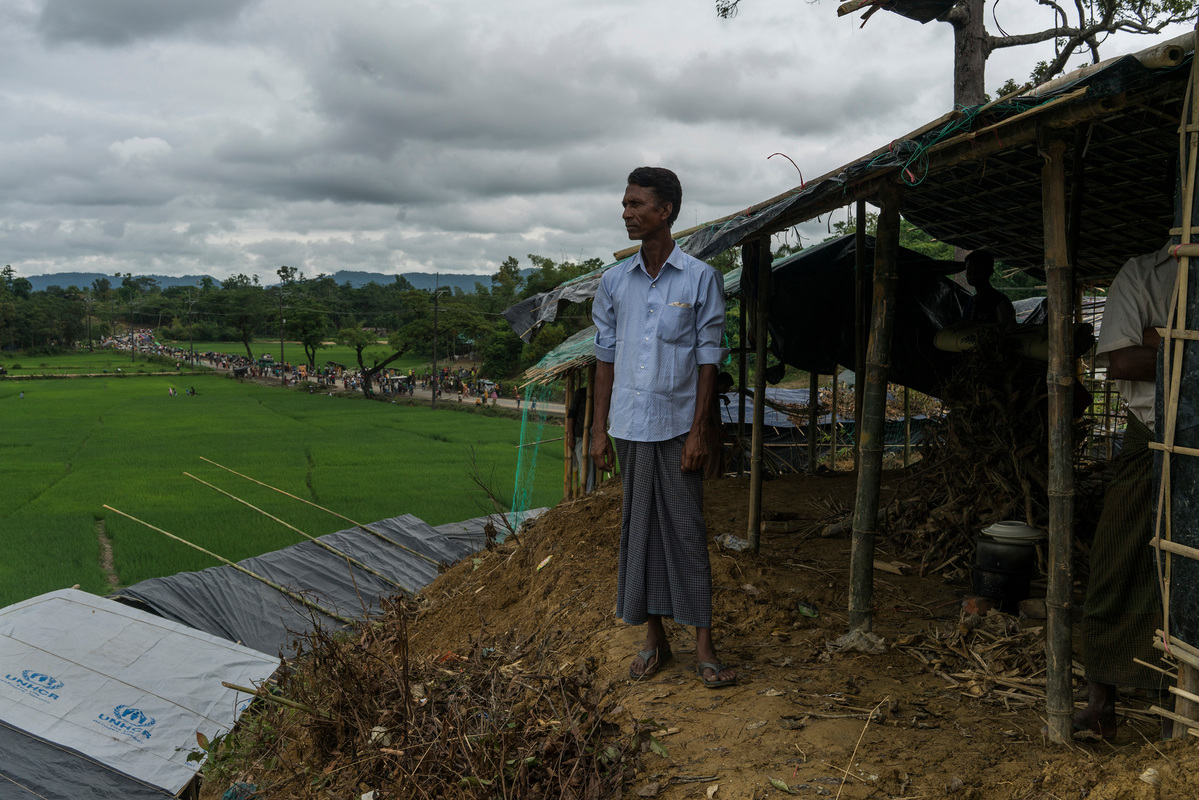 Bangladesh. Jaheed Hussain, a Rohingya refugee, in his shelter in an informal settlement