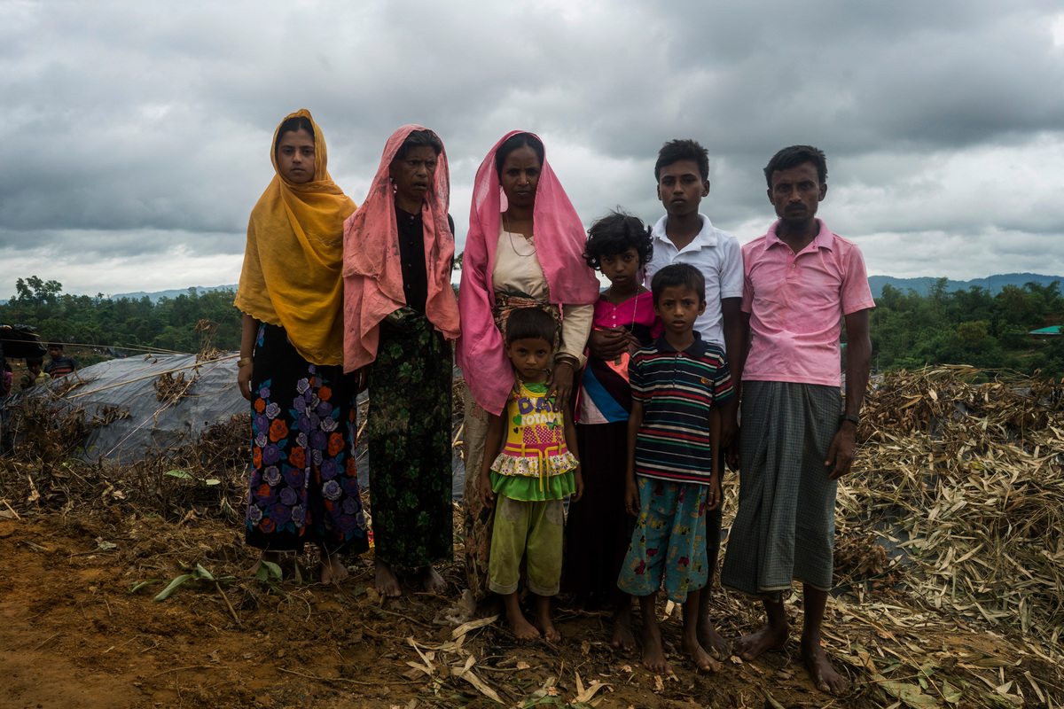 Jaheed and his family of nine have set up a bamboo shelter under a tarpaulin roof that a local Bangladeshi family gave them on the side of a muddy hill.