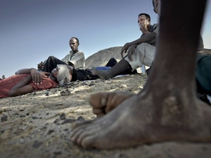 A group of men wait in a cove near Bossaso for a boat to take them across the Gulf of Aden to Yemen.