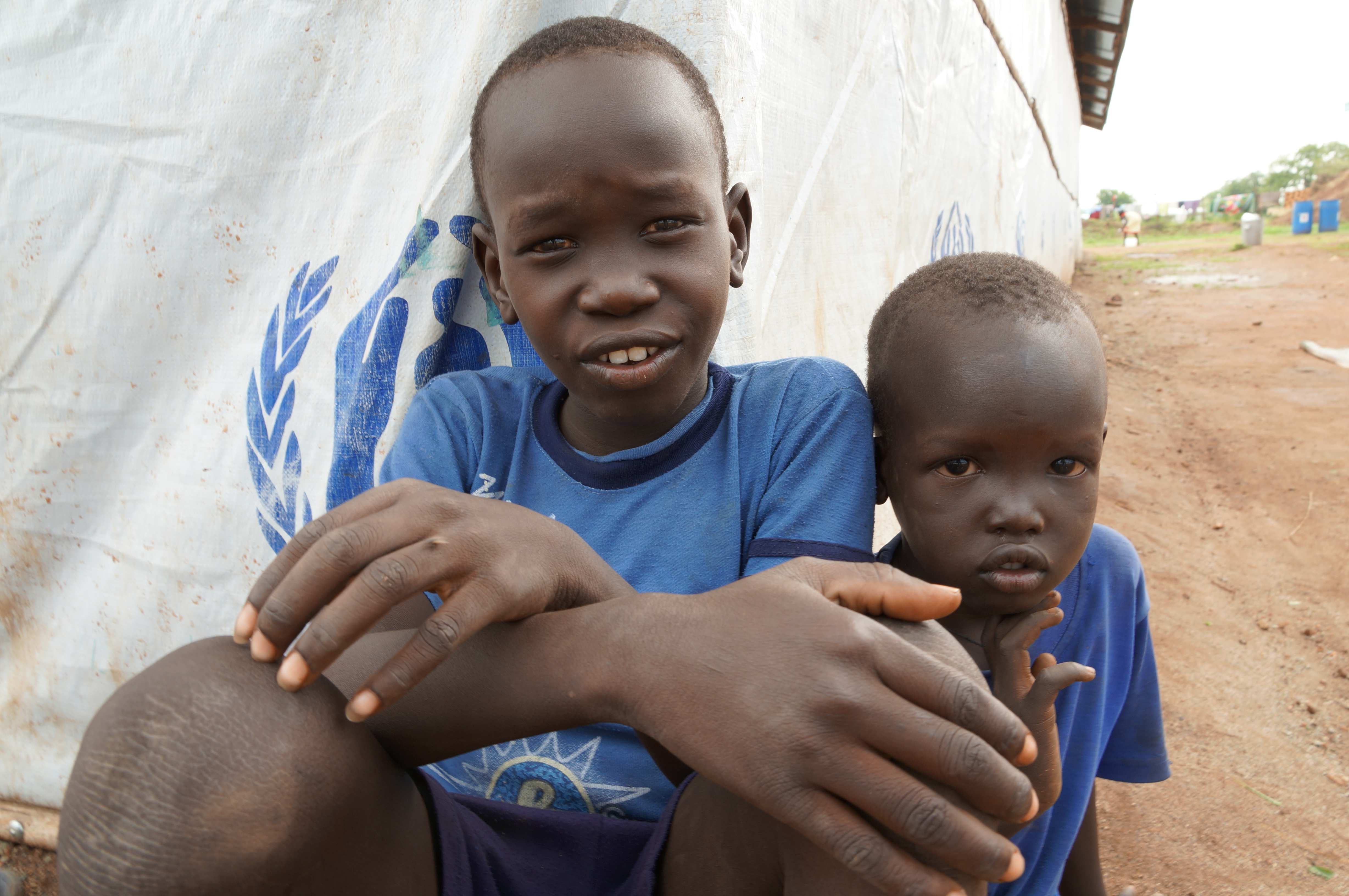 Two boys recently returned from Juba wait for a bus to take them to their village.