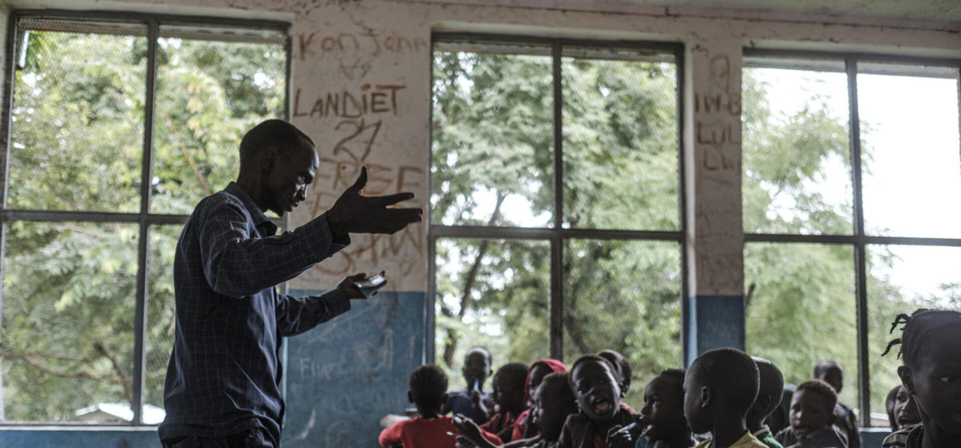 The 41-year-old has his pupils on their feet, clapping and reciting the alphabet in Nuer, their native tongue, followed by a few phrases that are sung with gusto in English. He believes children learn better when their lessons are lively and fun.