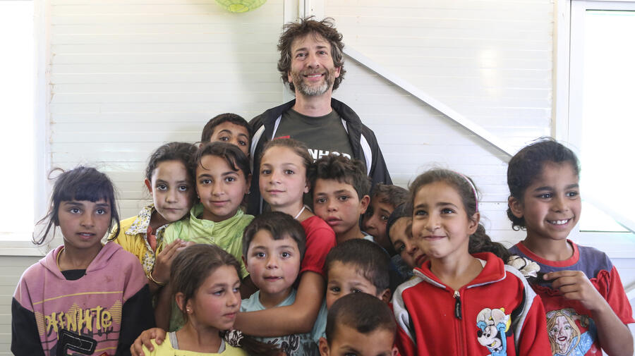 Writer Neil Gaiman, seen here with Syrian refugees in Jordan, was one of the many celebrities who helped spread the word about World Refugee Day.