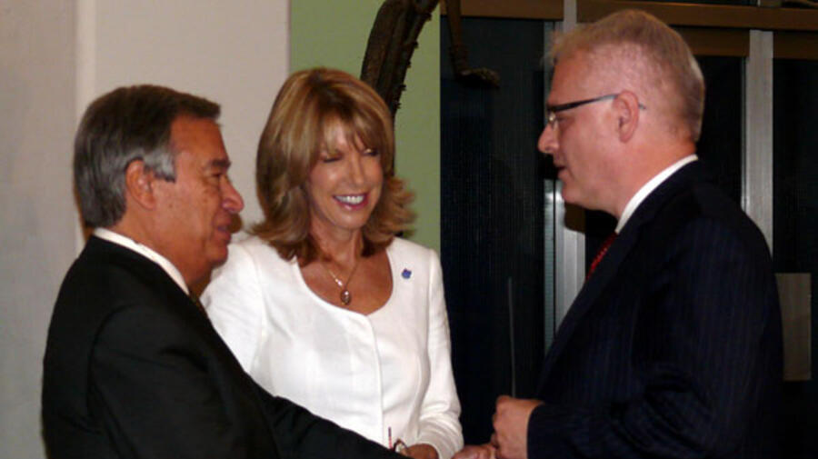 UNHCR chief António Guterres congratulates Croatian President Ivo Josipović on the accession as Patricia O'Brien, UN Under-Secretary-General for Legal Affairs, looks on.