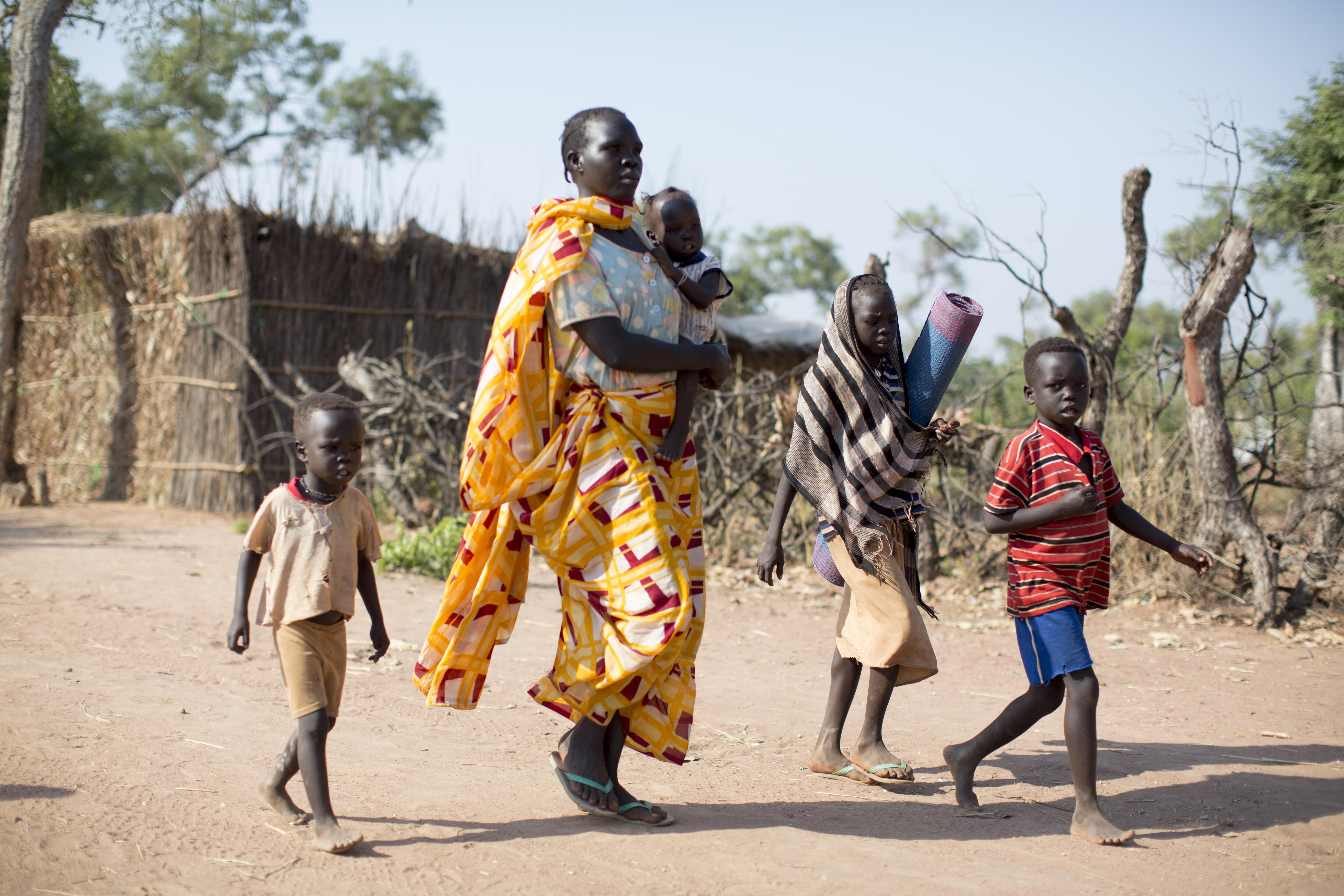 Sudanese refugee Amal Bakith walks with her children to the new plot of land that UNHCR has allocated to her in Ajuong Thok camp, South Sudan.