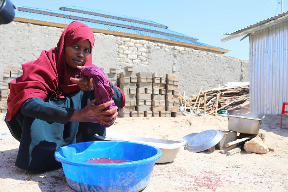 She soaks it in a mixture of salt, hot water and dye for a few hours and, after rinsing it, reveals a beautifully patterned cloth that she hangs out to dry. This is another of her intricately designed tie-and-dye fabrics that have made her renowned in Kismayo.