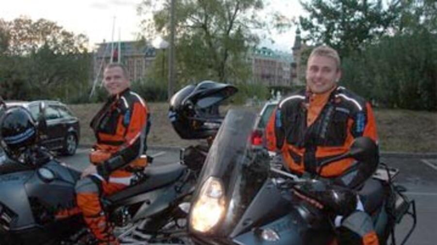 Around the world through 80 countries. Swedish bikers Gustav Roken (left) and Marcus Bernestom.