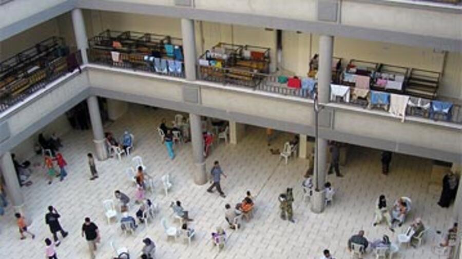 Lebanese displaced by the conflict in their country gather in the courtyard of Damascus's Al-Shariya High School.