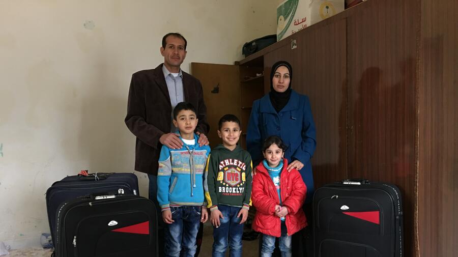 Abdel Moein Al Abed, his wife Fatima, eight-year-old twins Mohamad and Jomaa, and daughter, Shahd, five, prepare to leave Kahlouneye, Lebanon, for resettlement to Tampa, Florida.