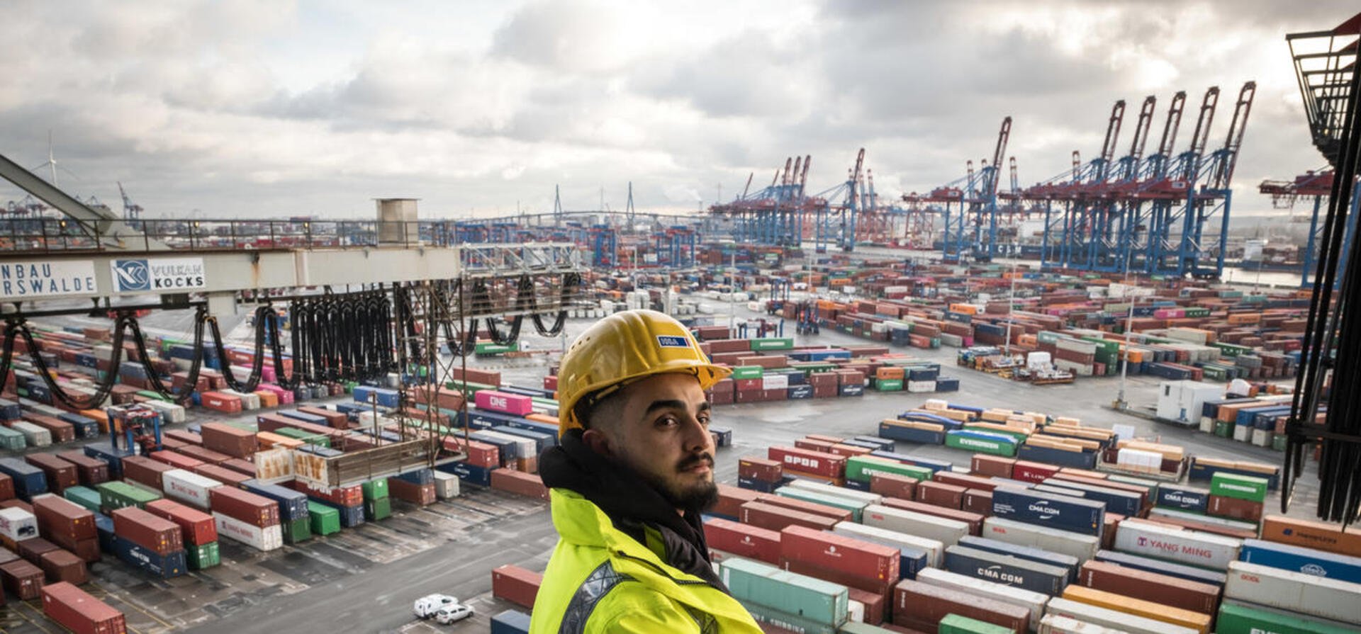 He is learning to repair the cranes that unload containers from gigantic freight ships docked in the Elbe river. He also maintains the automated rail-mounted cranes that lift containers out of temporary storage for transfer to trains and trucks.