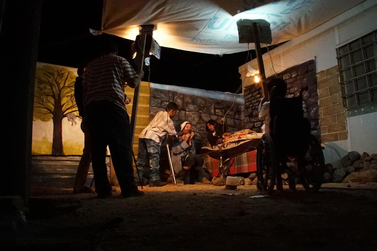 Ahmed Hareb and his friends are about to start filming on their soap opera, entitled Ziko & Shreko. It offers a humourous take on serious issues affecting Syrian refugees, including child labour and early marriage. They often film at night due to the lack of electricity in the camp during the day, when they hold rehearsals instead.