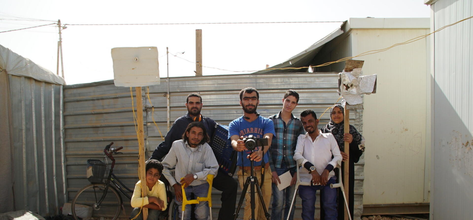 Ahmed stands with his filming crew in Jordan's Za'atari refugee camp.