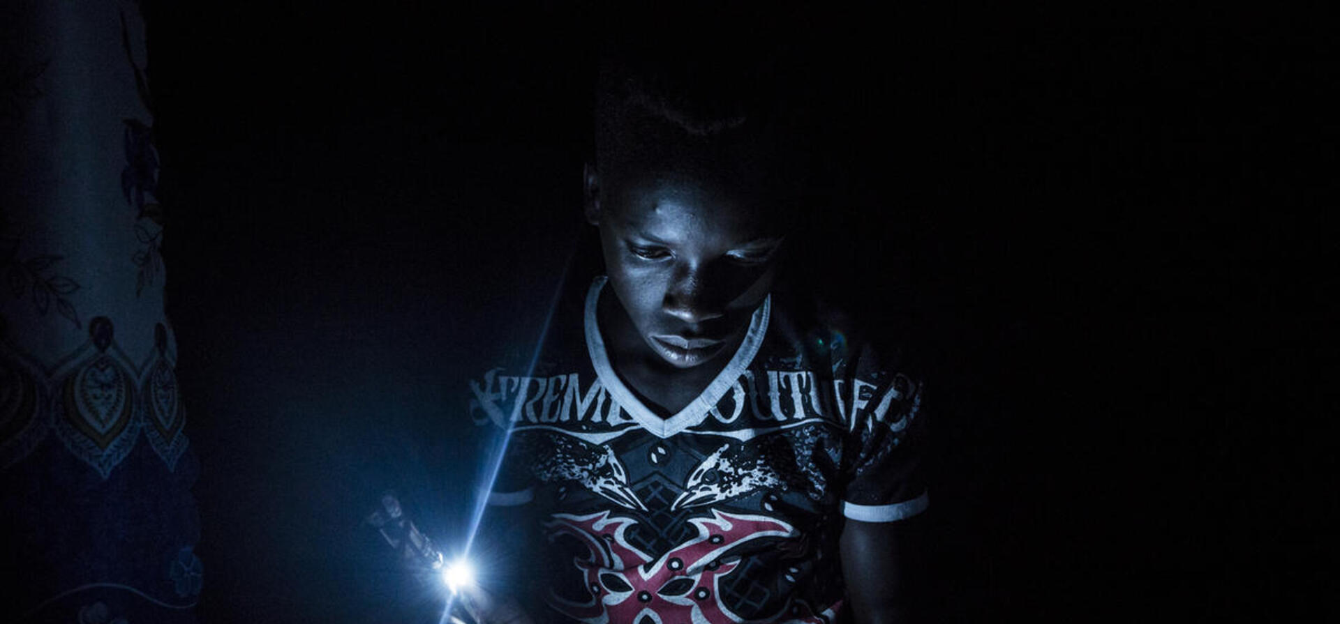 Gift, 14, reads with a solar-powered lamp he built in the Democratic Republic of the Congo.