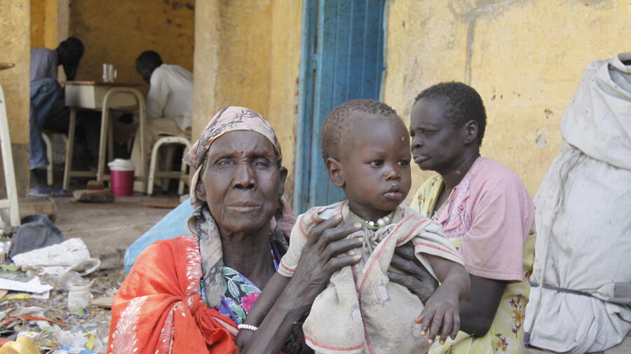 An elderly woman holds her grandson while his mother prepares food at a secondary school in Malakal, capital of Upper Nile state. Access to the town has been affected by fighting.