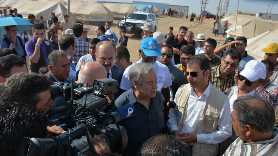 Guterres witnessed the dire conditions facing some of the more than 650,000 Iraqis displaced by conflict since January. At the Khazair transit camp, midway between the Iraqi cities of Erbil and Mosul, he walked the dusty paths between some 500 tents provided by UNHCR where Iraqi Shiites, Sunnis and others are now living.