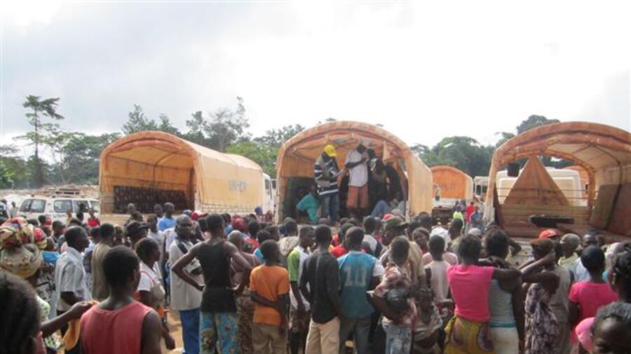 A convoy carrying 118 people left the Solo refugee camp and arrived four hours later at a transit centre in Toulepleu, Côte d'Ivoire.