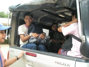 A group of refugees from Myanmar sit in a pick-up truck near Mae Sot on Tuesday.