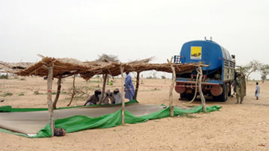A water tanker arrives to fill the water bladders at Am Nabak Camp in Chad close to the Sudanese border.