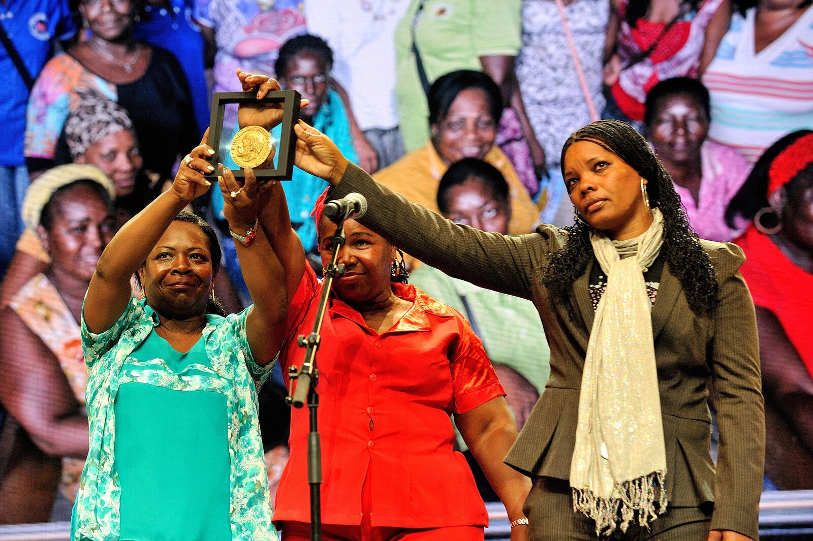 The UN High Commissioner for Refugees, António Guterres, presented the award and Nansen Medal to three representatives of the women's rights group: Gloria Amparo, Maritza Asprilla Cruz and Mery Medina.