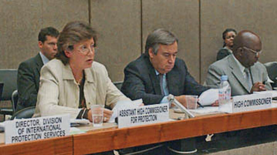Assistant High Commissioner for Protection Erika Feller (left) addresses the Excom meeting with High Commissioner António Guterres to her side.