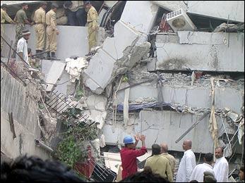 Rescue workers look for survivors after the collapse of Margalla Tower in Islamabad. The worst-hit areas, however, are in the country's north, in Pakistan-administered Kashimir and North West Frontier Province.