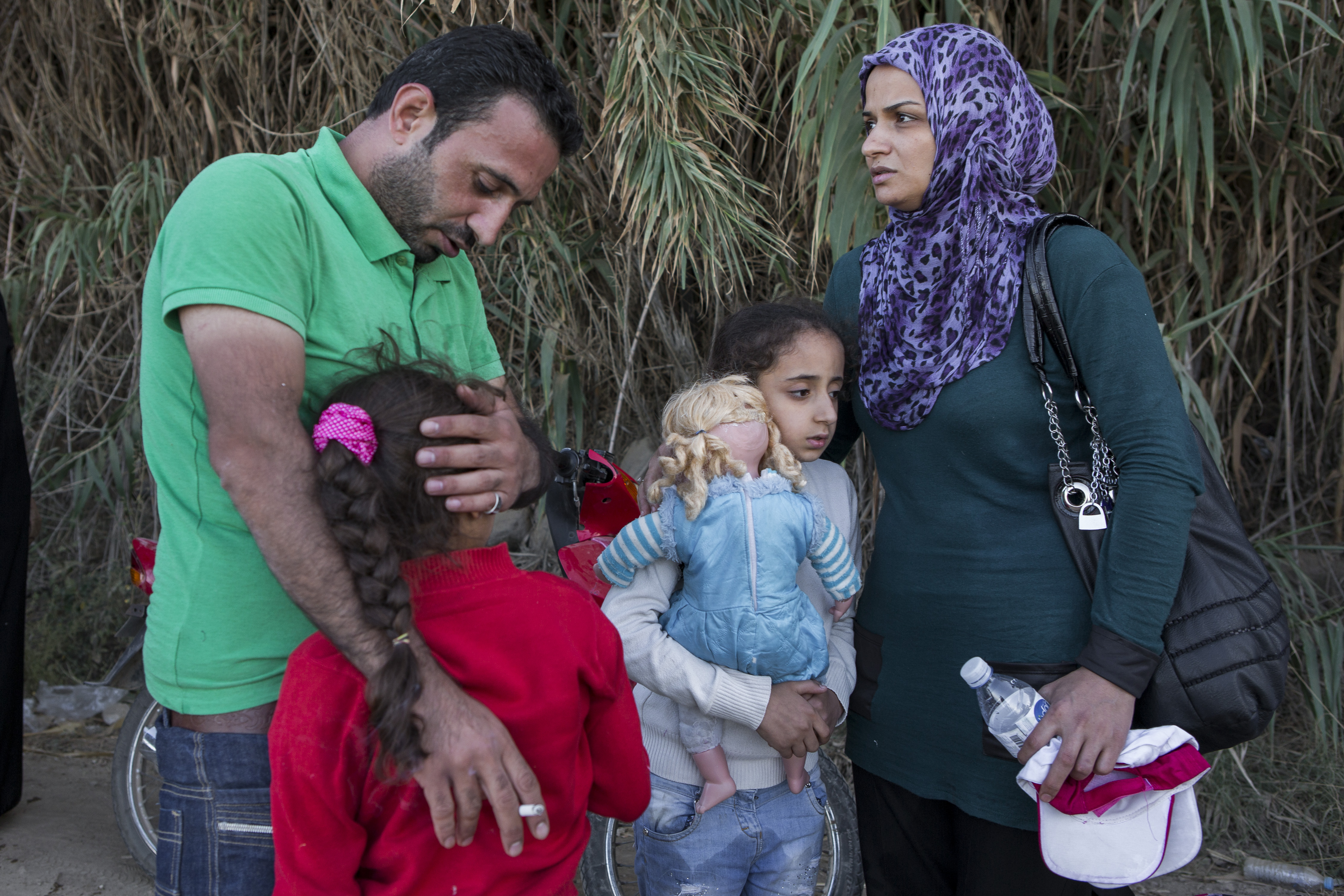 Syrian refugee parents Afeesh and Rasha hug their daughters shortly after landing on the Island of Lesvos, Greece.